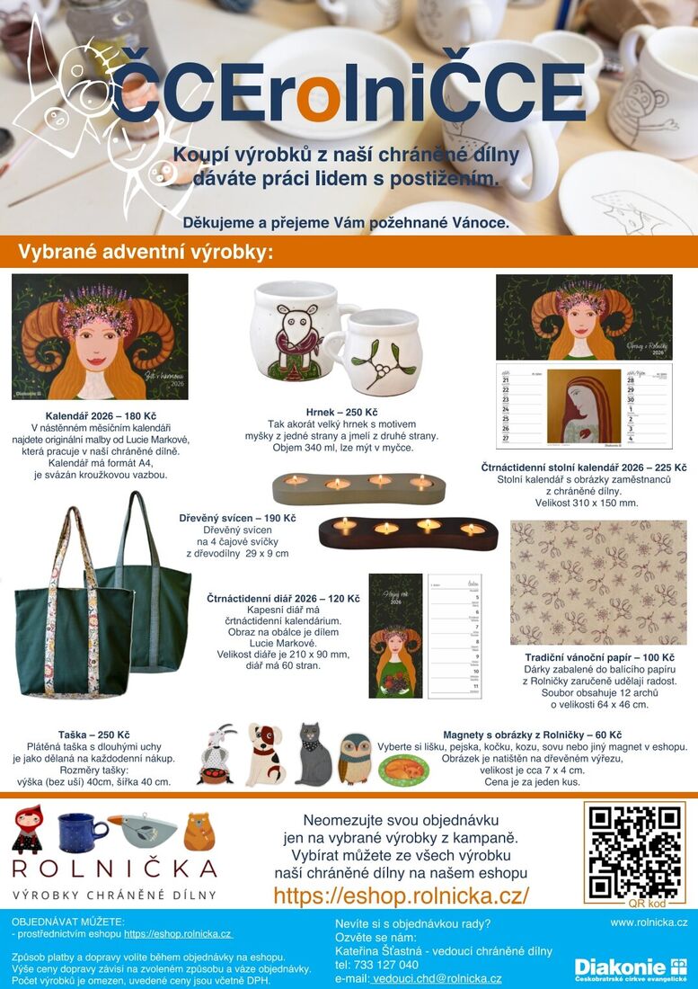 Přikládáme nabídkový plakát se speciální vánoční nabídkou. Je ovšem možné objednávat i jiné výrobky z celé nabídky e-shopu střediska, který najdete na adrese https://eshop.rolnicka.cz/. Vánoční nabídku zde najdete pod záložkou "ČCE RolniČCE".